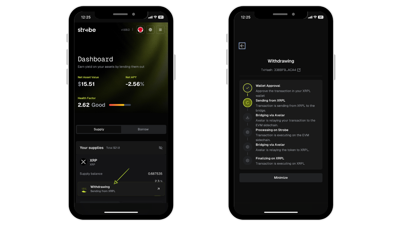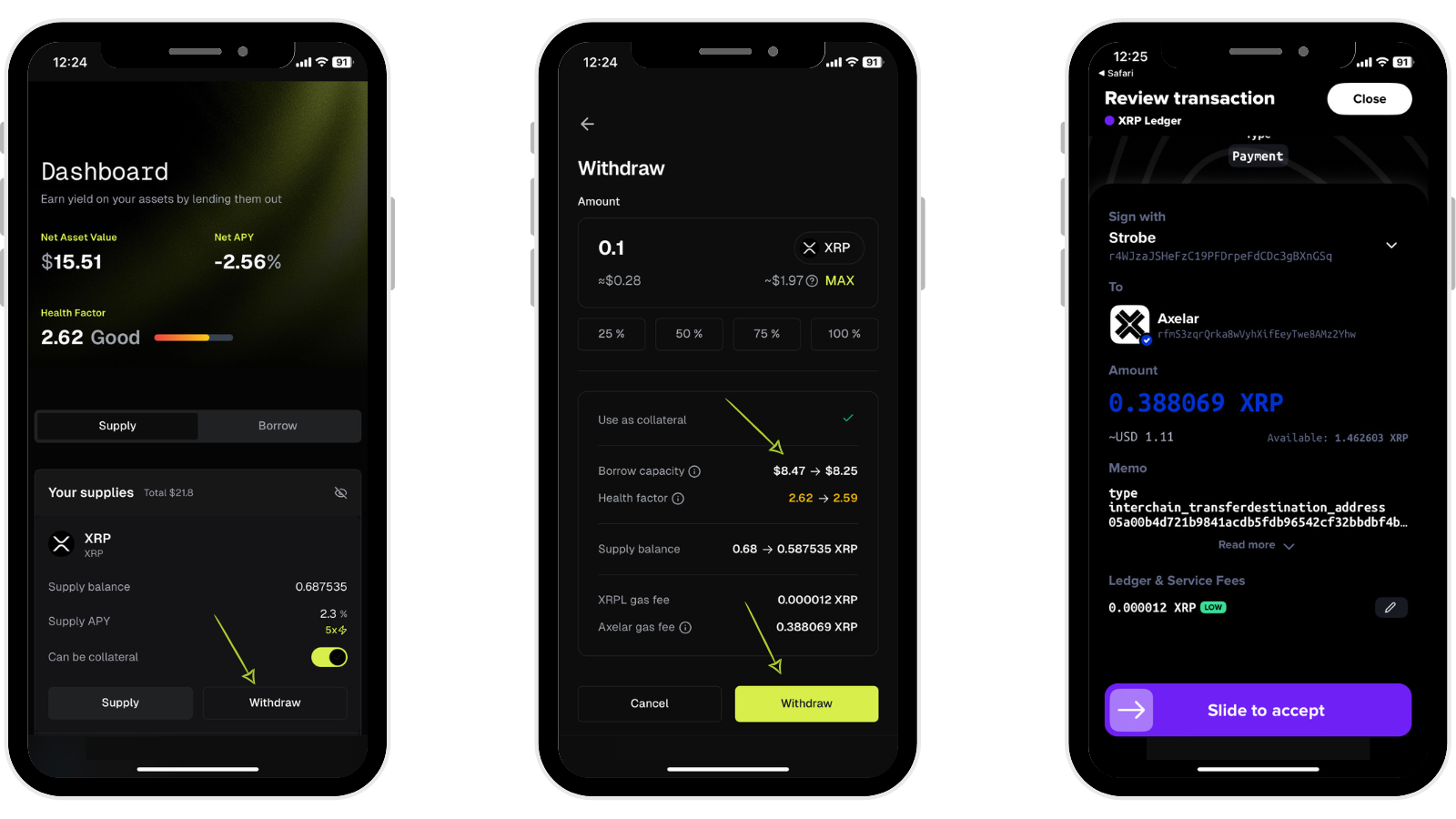After inputting your desired amount you will see the window change to reflect how much this will influence your account. Once you have confirmed, select **'Withdraw'.** You will need to sign this transaction within your wallet application